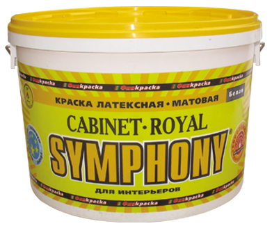 Латексная акрилатная матовая краска с повышенной укрывитостью и белизной Симфония Кабинет-Ройал. Выдерживает легкое влажное мытьё. Предназначена для грунтования и окраски стен и потолков в сухих помещениях, в том числе и жилых.