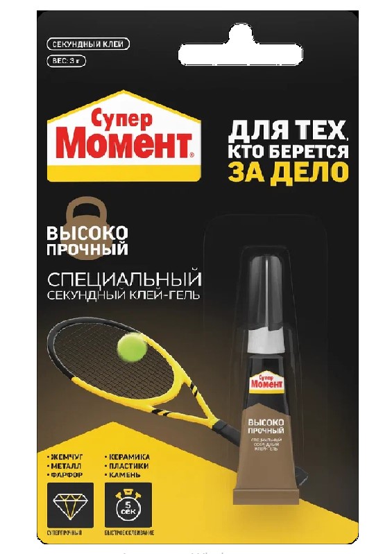 Супер Момент Высокопрочный является универсальным секундным клеем в форме геля, отлично подходит для соединения различных материалов. Водостойкий и термостойкий, обладает повышенной прочнойстю клеевого шва. Быстрый, прозрачный, не растекается.