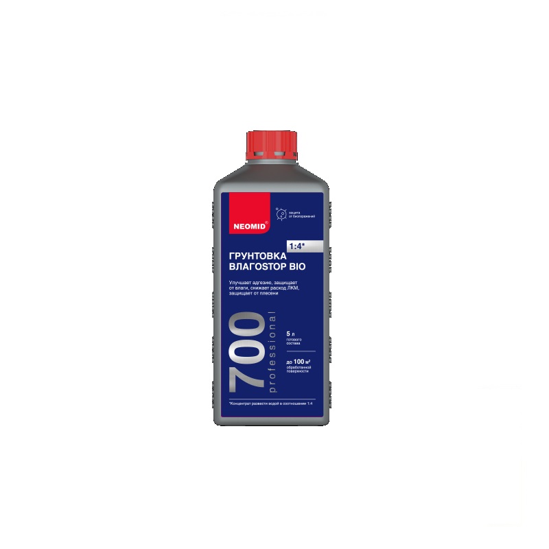 Неомид BлагоStopBiO – грунт- влагоизолятор с биоцидной добавкой для наружных и внутренних работ. Предназначен для грунтования поверхностей различных материалов, в том числе чувствительных к влаге (гипсокартонные плиты, газобетон, гипсовые блоки, бетон, керамический и силикатный кирпич, камень, штукатурка, ДСП, фанера и другие материалы), с целью уменьшения пористости поверхности, выравнивания ее впитывающей способности, улучшения сцепления отделочных материалов с основой и увеличения прочности поверхностного слоя, снижения расхода ЛКМ, защиты от влаги и поражения плесневыми грибами (плесенью).