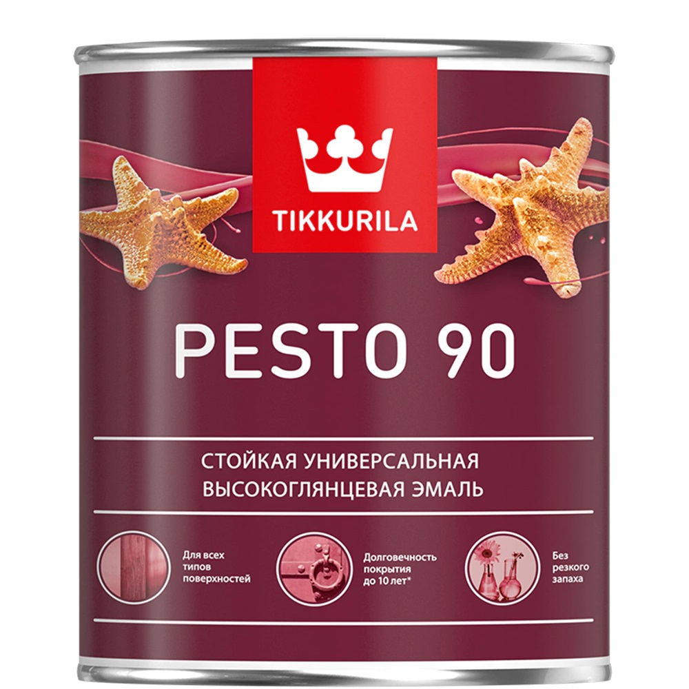 Стойкая высокоглянцевая эмаль TIKKURILA Pesto 90 для окраски деревянных, металлических, оштукатуренных, бетонных, зашпатлеванных, кирпичных, гипсовых поверхностей внутри и снаружи помещений.