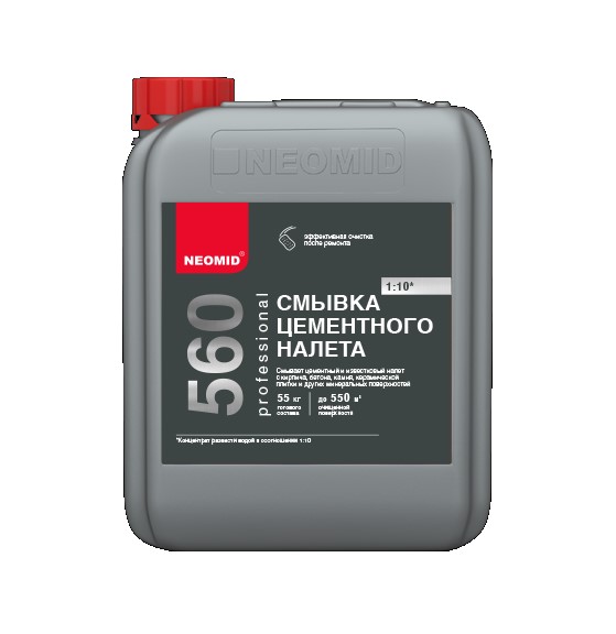 NEOMID 560 — состав для удаления цементных, известковых и гипсовых загрязнений c бетона, кирпича, керамической плитки, и других минеральных поверхностей.