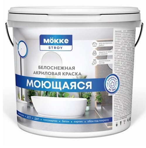 Краска водно-дисперсионная MÖKKE STROY предназначается для покраски стен и потолков во влажных помещениях, в том числе в лечебно-профилактических учреждениях с влажным режимом, а также для стен и потолков в помещениях, от поверхности которых требуется стойкость к мытью и износу, например, в подъездах, больницах и т.д.