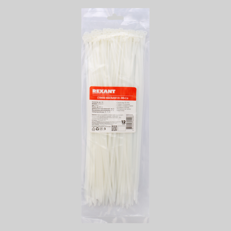 Нейлоновый хомут (кабельная стяжка) REXANT представляет собой белую гибкую полоску из полиамида с замковым механизмом одностороннего действия. Используется для крепления или соединения в жгут проводов, кабелей и любых разновидностей труб. Прочность, эластичность и простота монтажа позволяют использовать их на предприятиях и в быту.