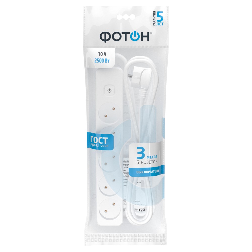 Удлинитель сетевой "ФОТОН" 10-35S,3м,5 розеток,10А, с выкл.Белый