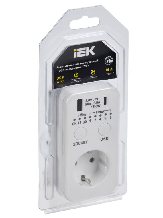 Розетка-таймер РТЭ-4 электрон. USB A+C 15мин-8ч 16А IP20 белый IEK