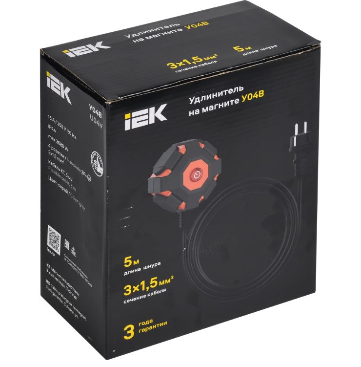 Удлинитель на магните У04В 4 места с защит крышками IP44 с з/к 5 м КГ 3х1,5мм2 16А/250В IEK