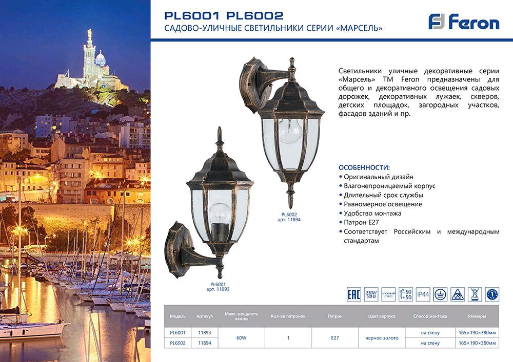 Светильник уличный настенный FERON PL6002 вниз черненое золото 60W 230V E27 11894 IP44