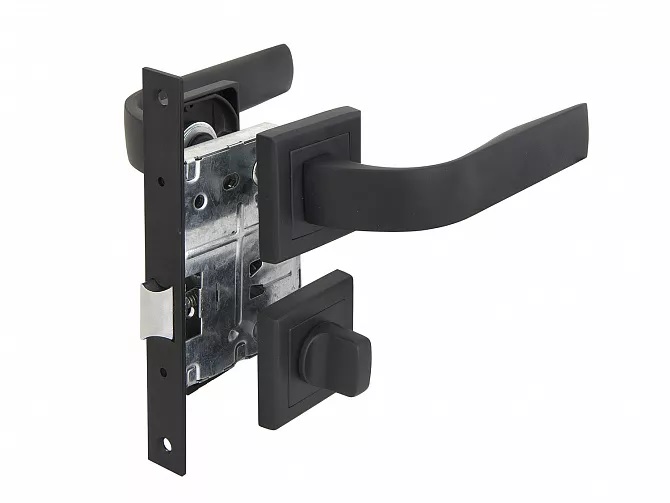 В упаковке: черные дверные ручки на квадратной розетке (2 шт.), сантехнический межкомнатный замок под фиксатор, ответная планка к замку, накладки (2 шт.), квадрат 8x8 мм, квадрат 6x6 мм, шестигранник, стяжные винты (4 шт.), шурупы (16 шт.).