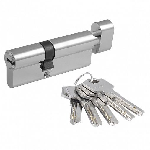 Цилиндр для межкомнатных и входных дверей. Материал ЦАМ (сплав цинка, алюминия и меди). В комплекте 5 стальных перфорированных ключей. 5-6 пинов в зависимости от размера. Цилиндр имеет вертушку для удобного запирания изнутри помещения без использования ключа. Длину цилиндра подбирайте исходя из толщины двери, с небольшим запасом под накладку.