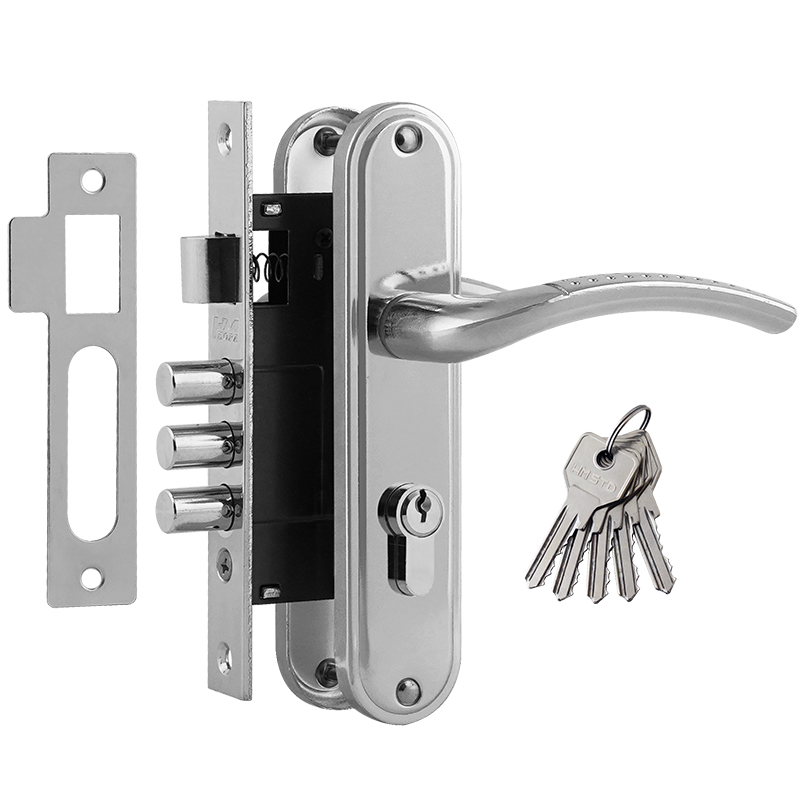 Комплект состоит из: ручек на планке (2 шт.), корпуса замка (1 шт.), цилиндрового механизма (1 шт), ключей (5 шт), ответной планки (1 шт.). Также в комплекте идёт крепеж для установки корпуса, ручек на планке и цилиндра.