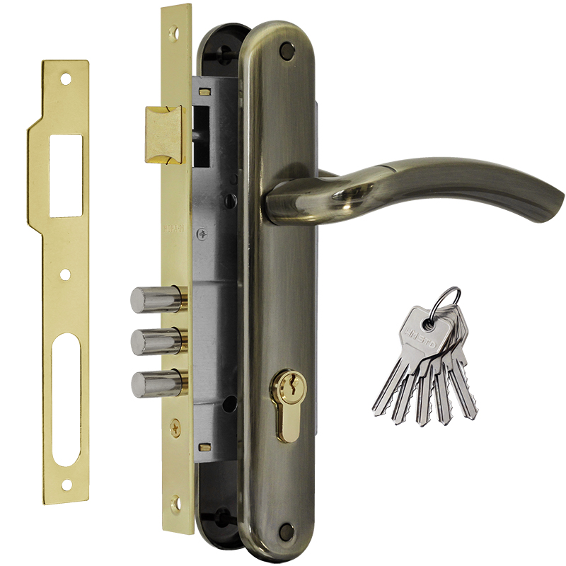 Комплект состоит из: ручек на планке (2 шт.), корпуса замка (1 шт.), цилиндрового механизма (1 шт), ключей (5 шт), ответной планки (1 шт.). Также в комплекте идёт крепеж для установки корпуса, ручек на планке и цилиндра.