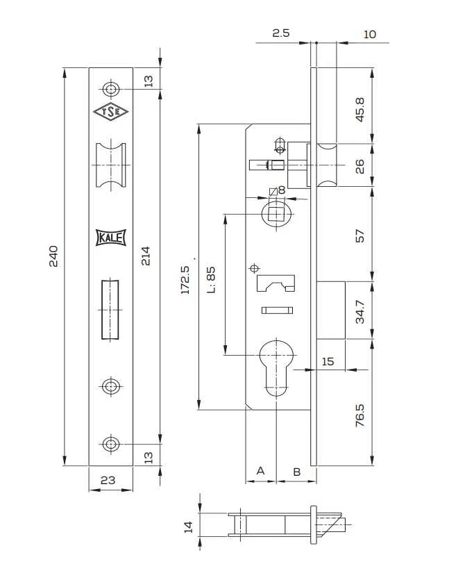 Замок врезной цилиндровый узкопрофильный KALE KILIT 153,85BS30,23NP,w/o SP,w/o Ros,STB
