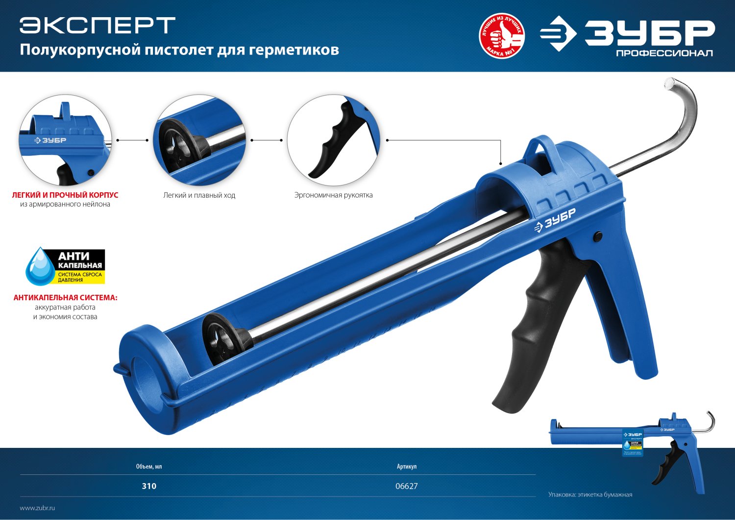 Пистолет для герметиков подходит для работы с картриджами объемом 310 мл, имеет прочный корпус из армированного нейлона скелетного типа,