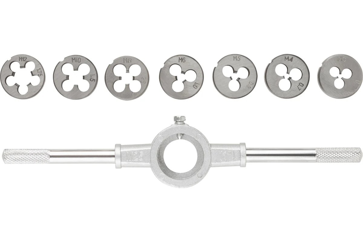 Плашки метрические легированная сталь, 8 шт. М3-М12+ плашкодержатель FIT