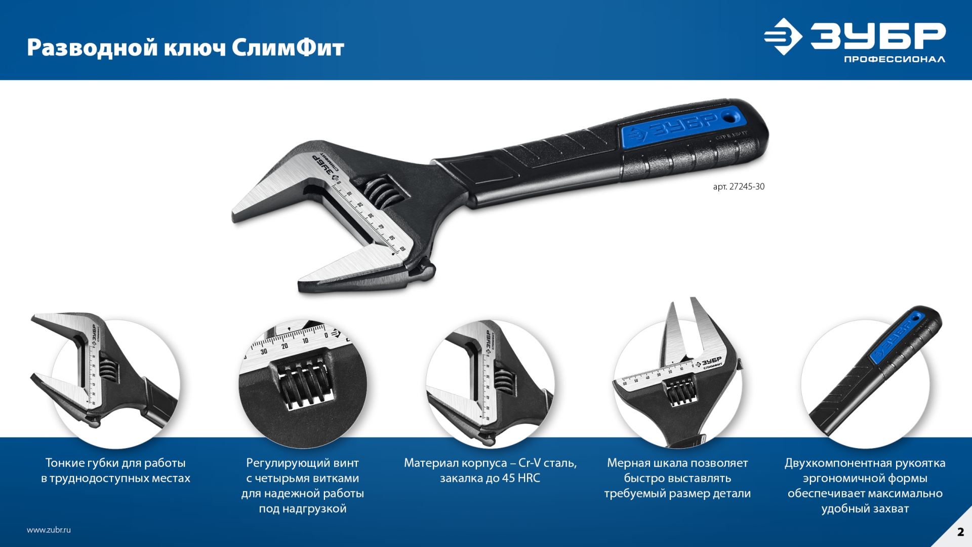 Ключи разводные ЗУБР ″СлимФит″ изготовлены из высокопрочной легированной стали CR-V, защищены от коррозии благодаря фосфатированному покрытию.