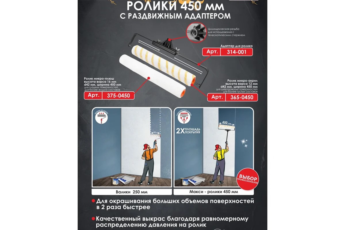 Регулируемый адаптер для ролика DECOR с возможностью установки роликов шириной от 250 до 480 мм, что позволяет значительно сократить время покраски и получить ровное покрытие без разводов и брызг.