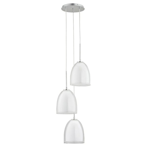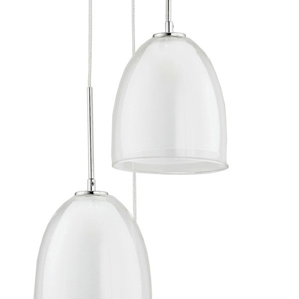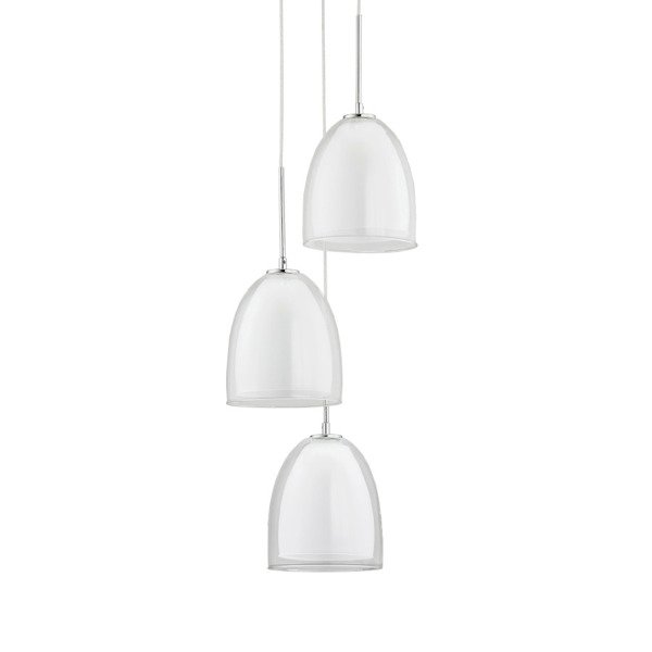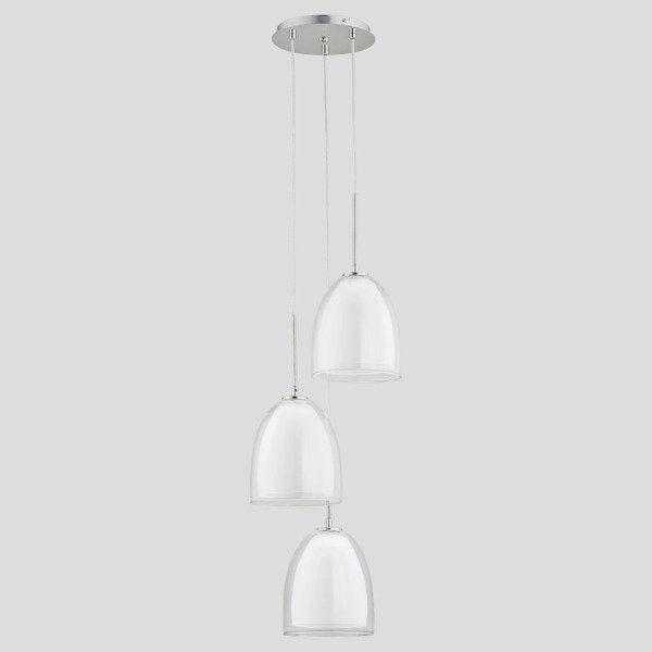 Подвесной светильник RONDA из стеклянных абажуров в современном стиле. Он прекрасно вписывается в интерьер гостиной, столовой, а также в современные коммерческие помещения, например, бары, рестораны и вестибюли. Максимальный свес 100 см. Светильник на три лампочки Е27 (не входит в комплект). Прозрачный кабель.