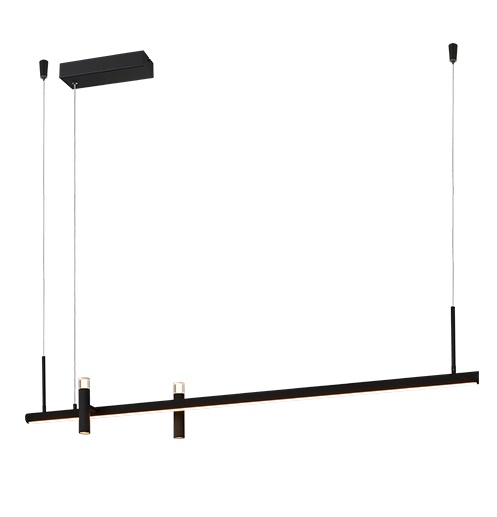 Светильник 51318P - современный светодиодный подвесной светильник в стиле минимализма. Лаконичная черная штанга с вертикальными цилиндрическими элементами, подвешенная на тонких тросах. Подобные модели часто используются для освещения обеденных зон, кухонных островов или офисных пространств благодаря их направленному свету и эстетичному виду.