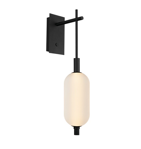 Современный настенный светильник (бра) 61850W в минималистичном стиле. Эта модель отличается вытянутым рифленым плафоном из матового белого стекла и черным металлическим основанием.