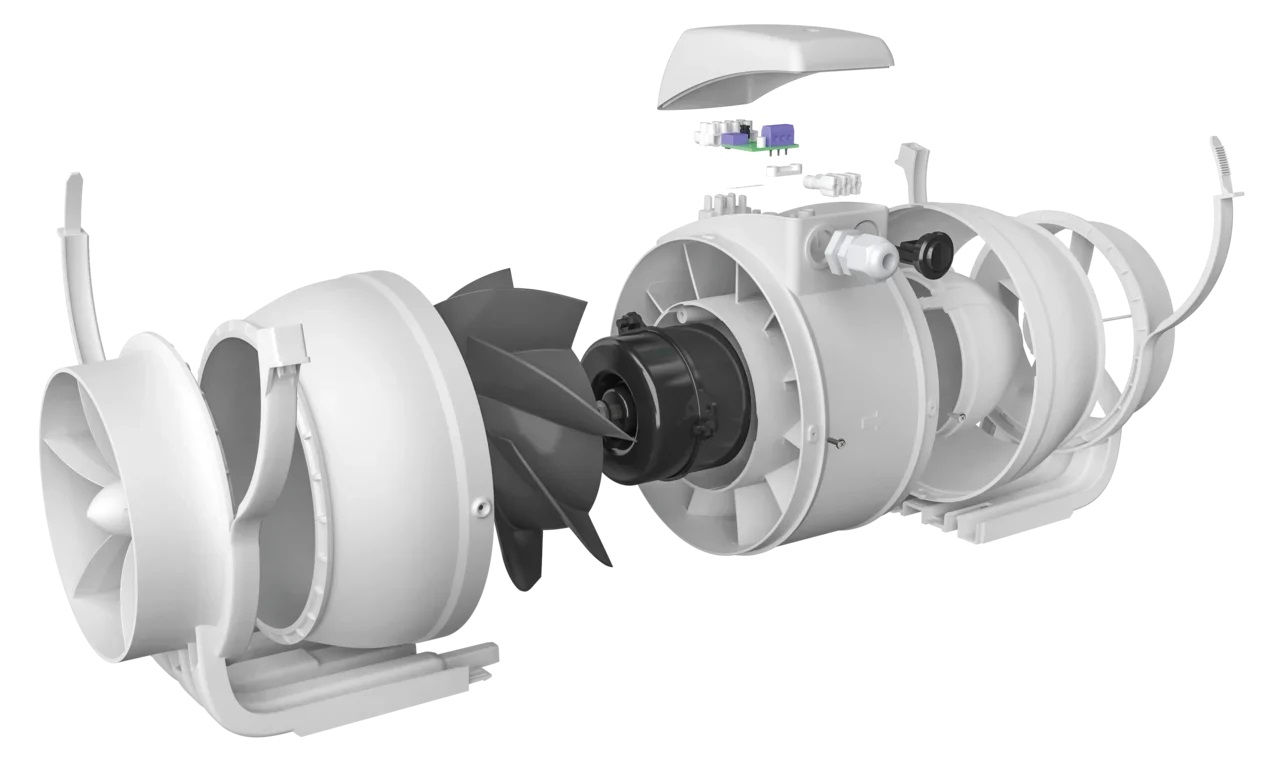 Канальный осевой вентилятор смешанного типа в корпусе из пластика. Предназначен для приточно-вытяжных систем вентиляции промышленных, общественных и жилых зданий. Имеет разборную конструкцию, что упрощает обслуживание: съемный центральный блок с двигателем, крыльчаткой и клеммной коробкой крепится к боковым патрубкам пластиковыми хомутами. В TYPHOON 125 2SP устанавливается двухскоростной однофазный двигатель на шарикоподшипниках с длительным сроком службы, встроенной тепловой защитой и автоматическим перезапуском. Асимметричная форма клеммной коробки облегчает подключение сетевого провода. Вентилятор имеет две скорости работы, выбор скорости осуществляется при подключении питания к клеммам, либо с помощью кнопки (входит в комплект, устанавливается самостоятельно по желанию пользователя). Устройство подходит для горизонтального и вертикального монтажа, крепление к поверхности осуществляется с помощью саморезов.