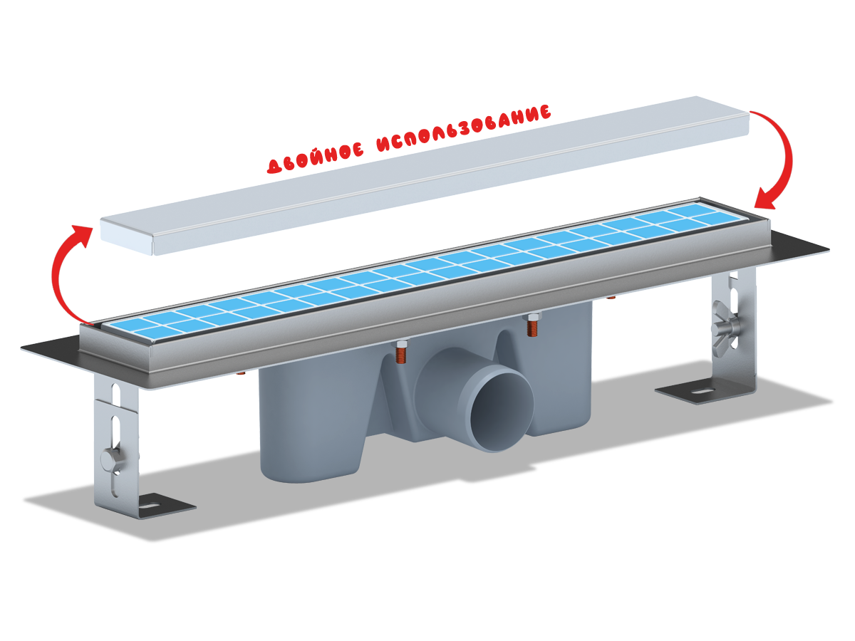 Сверху трап закрывает прямоугольная решетка из нержавеющей стали, которая задерживает мусор, препятствуя забиванию слива, а также выполняет декоративную функцию. Решетка может быть установлена как металлической стороной вверх, так и стороной под плитку, на нее можно становиться, принимая душ: изделие выдерживает нагрузку 300 кг.