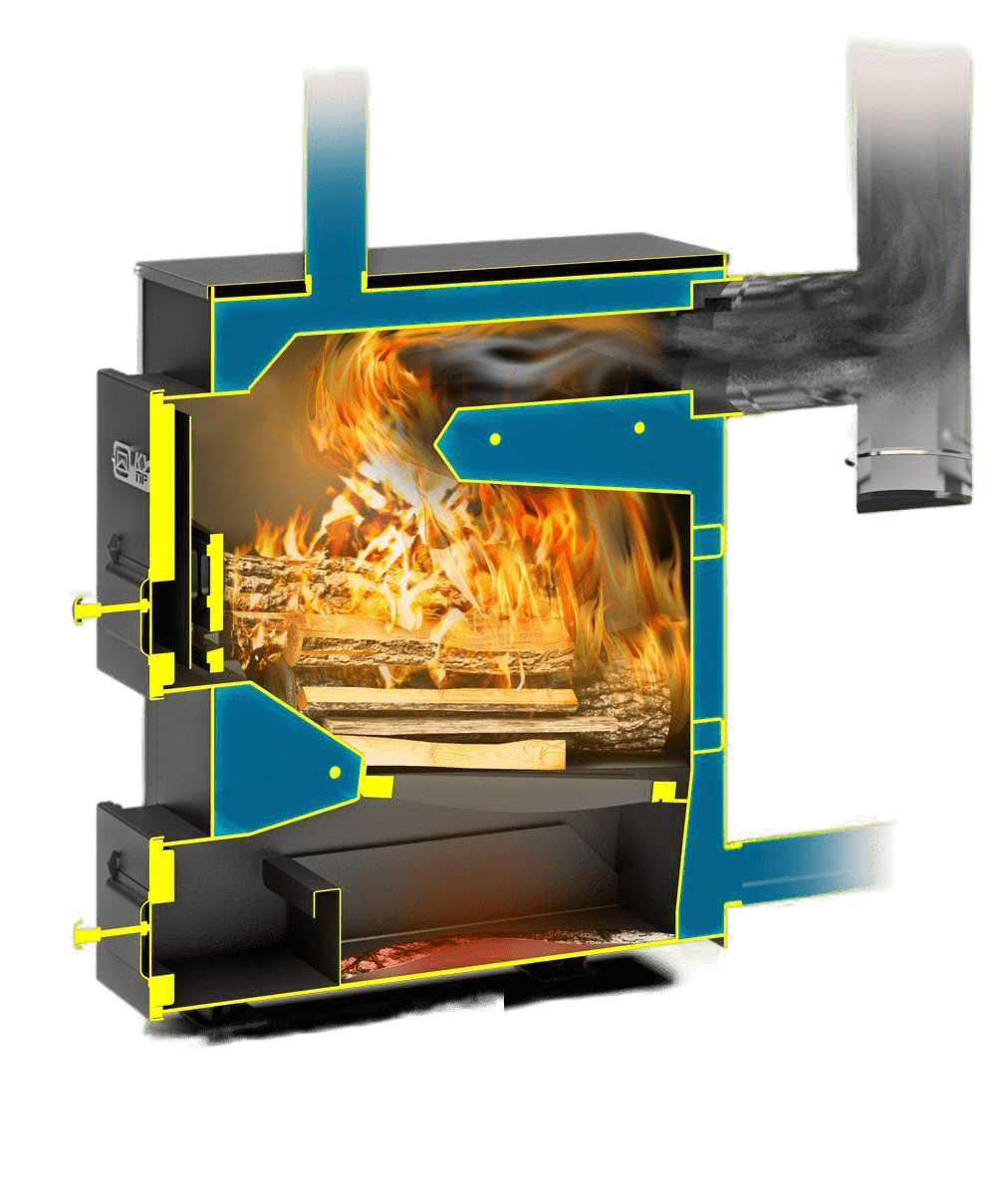 Глубокая наклонная топка для использования длинных дров и равномерного распределения угля по всей глубине топки при засыпке.
