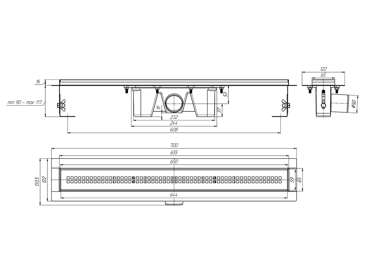 Имеет вытянутую прямоугольную форму, его также называют дренажным каналом или душевым лотком. Сверху конструкция трапа закрывается декоративной решеткой из нержавеющей стали. Это идеальное решение для помещений и с постоянным, и с редким водоотведением. Трап устанавливается в пол, общую высоту монтажа можно регулировать от 90 до 117 мм.