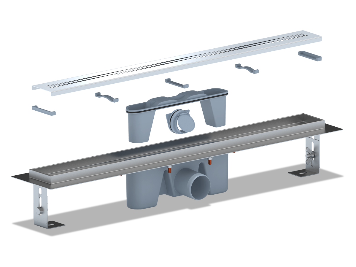 Сверху трап закрывает прямоугольная решетка из нержавеющей стали, которая задерживает мусор, препятствуя забиванию слива, а также выполняет декоративную функцию. На решетку можно становиться, принимая душ: изделие выдерживает нагрузку 300 кг.