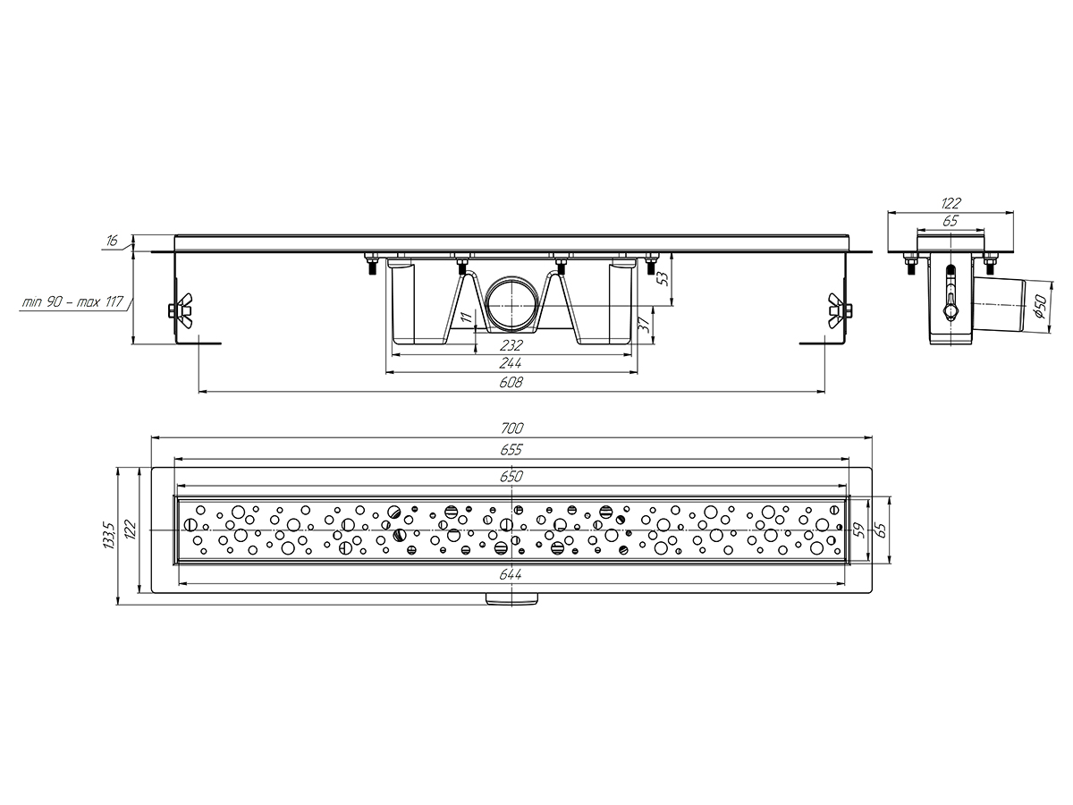 Трап линейный металлический с комбинированным затвором, с решеткой "Бриз" 650 мм. Решетка глянцевая