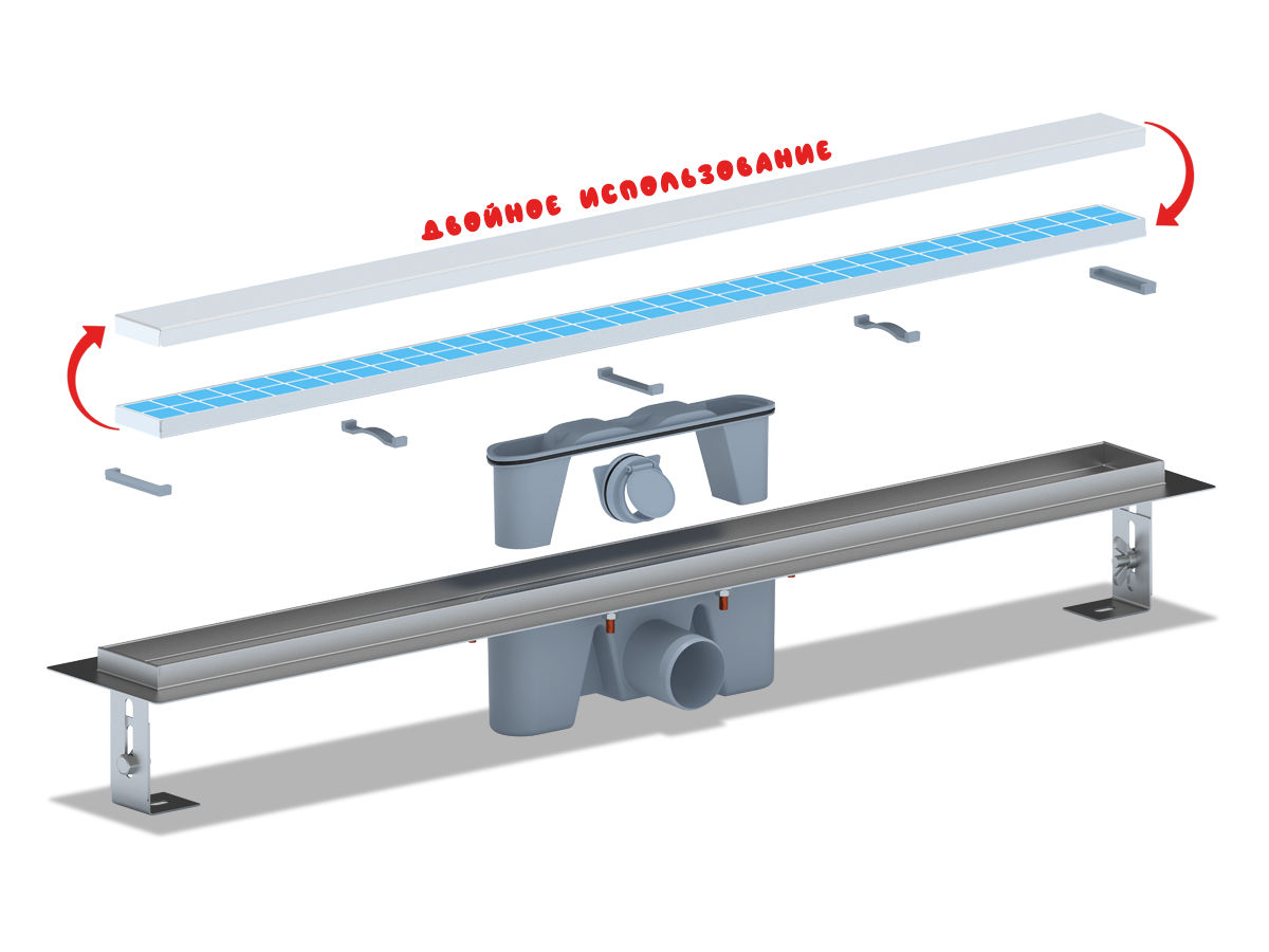 Сверху трап закрывает прямоугольная решетка из нержавеющей стали, которая задерживает мусор, препятствуя забиванию слива, а также выполняет декоративную функцию. Решетка может быть установлена как металлической стороной вверх, так и стороной под плитку, на нее можно становиться, принимая душ: изделие выдерживает нагрузку 300 кг.