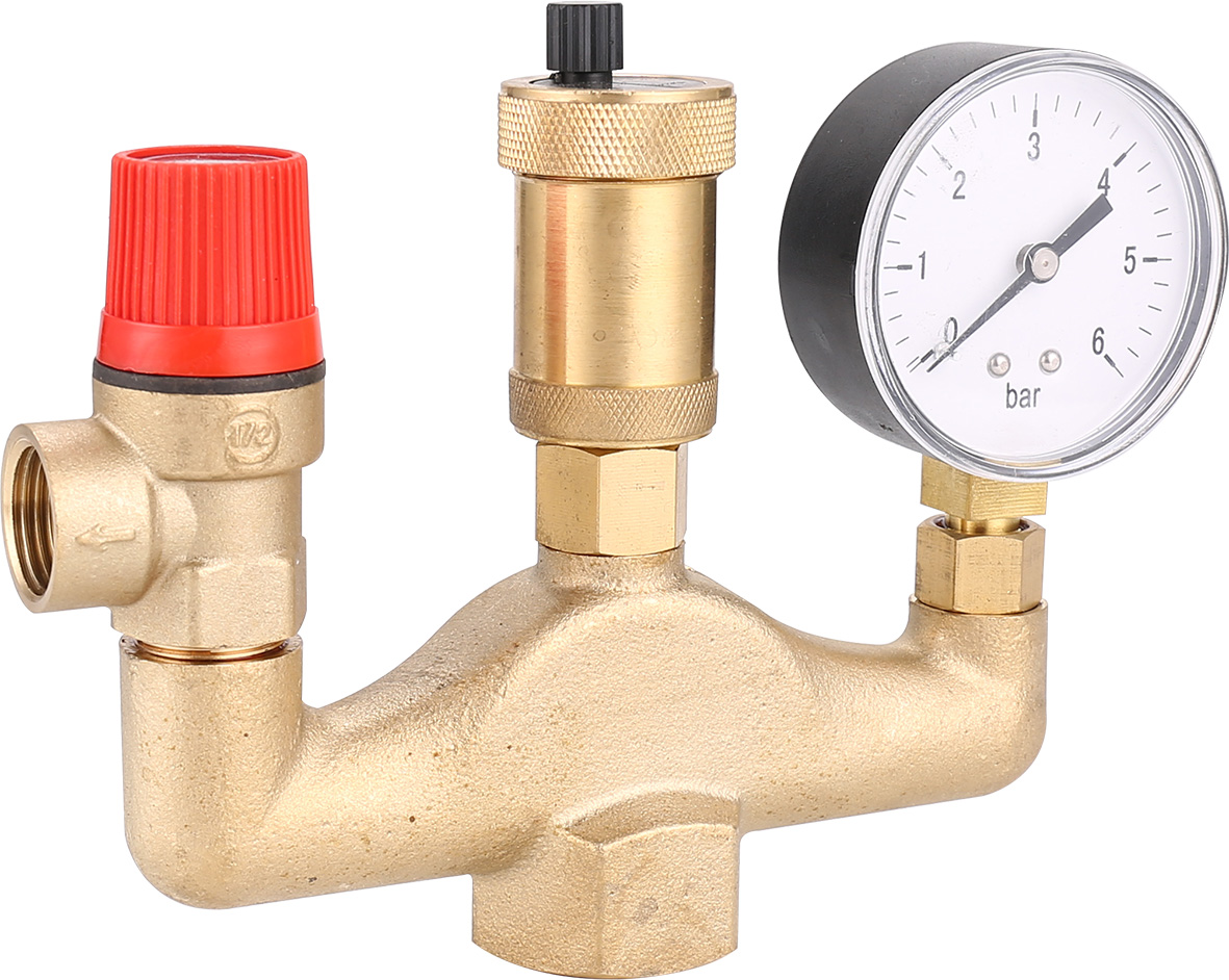 Конструктивно выглядит как единый коллектор, в котором имеются посадочные места с резьбой для интеграции трех приборов – манометра, воздухоотводчика и предохранительного клапана. Соответственно, группа безопасности для отопления способна выполнить 3 функции: