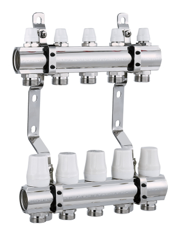 Коллекторный блок объединяет в себе подающий и обратный коллекторы из никелированной латуни, ручные запорно-регулирующие клапаны, термостатические клапаны (с возможностью установки электротермического сервопривода) и крепежные кронштейны. Коллекторные блоки могут работать как на водяном, так и низкозамерзающем (гликолевом) теплоносителе.