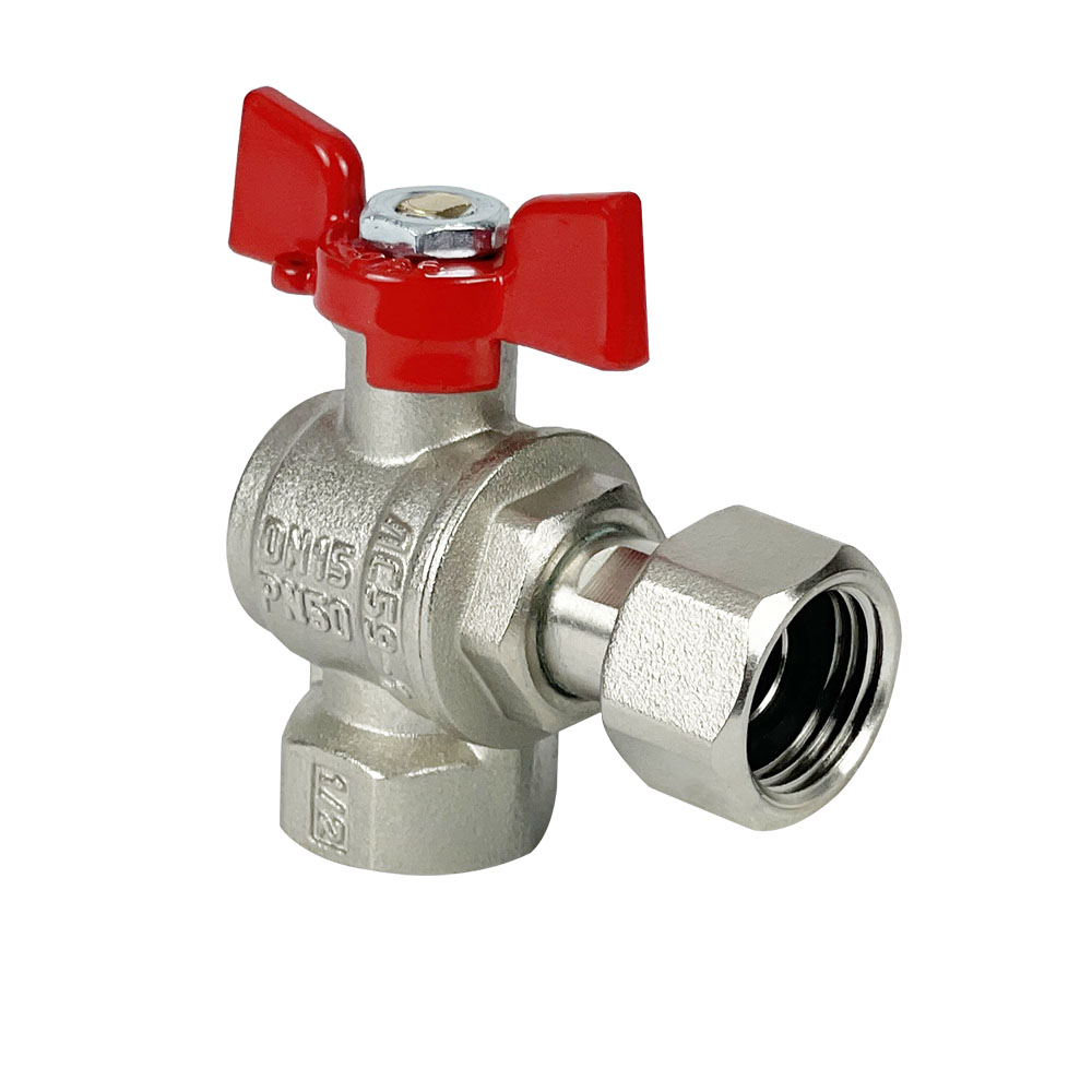 Краны шаровые муфтовые латунные угловые с накидной гайкой на номинальное давление PN 4,0 МПа (40 кгс/см²), PN 5,0 МПа (50 кгс/см²) и PN 6,3 МПа (63 кгс/см²), условного прохода (номинального диаметра) от DN 15 до DN 25, предназначенные для применения в качестве запорной арматуры в составе для промышленных и технических водопроводов горячей воды, пара, сжатого воздуха и в технологических трубопроводах, транспортирующих жидкости, не агрессивные к материалам крана.