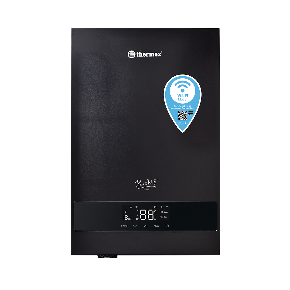 Удобное управление. Серия Thermex Boss оснащена электронным управлением, реализованным сенсорным дисплеем на фронтальной стороне корпуса, а также технологией Wi-Fi Motion, которая позволяет управлять котлом на расстоянии. На дисплее выведены все необходимые индикации для отслеживания работы котла, а также доступ к настройкам и программированию режимов работы. С помощью приложения Thermex Home пользователь может настраивать алгоритм работы из любой точки мира, следить за состоянием и изменениями температуры обогрева в зависимости от погодных условий за окном, получать оперативно уведомления о возникновении ошибок для своевременного устранения.