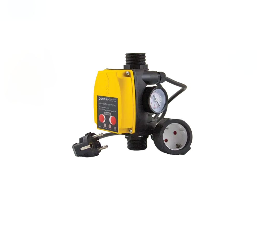 Блок автоматического управления насосом АКВАРОБОТ ТУРБИПРЕСС М2 предназначен для автоматического управления однофазными насосами мощностью до 1,5 кВт по потоку жидкости и по давлению в системе.