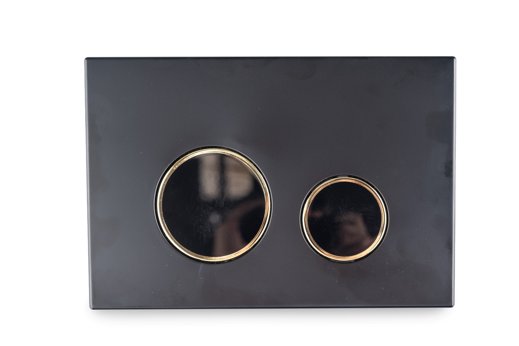 Клавиша смыва двухрежимная АНИ Пласт WP2353G механическая пластиковая, чёрная матовая, обод золото, клавиша чёрный глянец, используется для системы инсталляции.