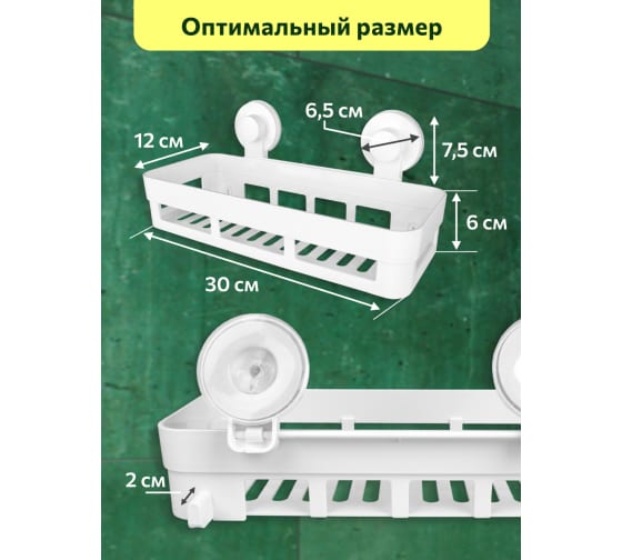 Дно полки оснащено отверстиями, вода не будет скапливаться. Конструкция имеет высокий борт для устойчивости аксессуаров.