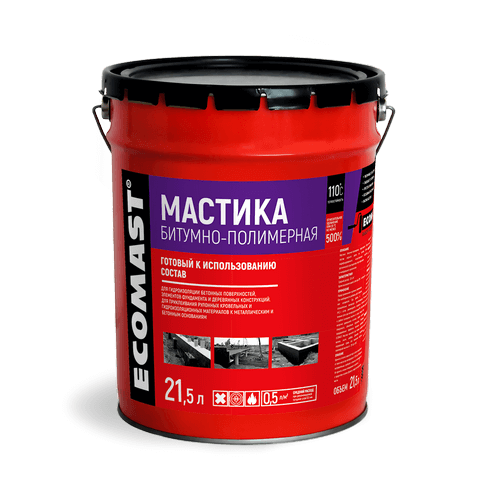 Мастика битумно-полимерная представляет собой состав черного цвета на основе битума, модифицированного искусственным каучуком, органического растворителя, пластификатора и минерального наполнителя.