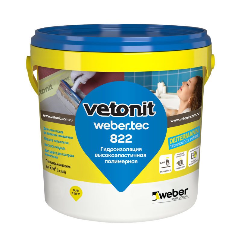 Жидкая полимерная гидроизоляция Weber.Тек 822 (ВэберТэк 822) используется для обработки и защиты влажных помещений внутри зданий. Рекомендуется для покрытия перед нанесением плиточных облицовок в санузлах, прачечных, душевых и ванных комнатах. Идеально подходит для приклеивания эластичных гидроизоляционных лент, легко наносится, обладает повышенной адгезией и прочностью.