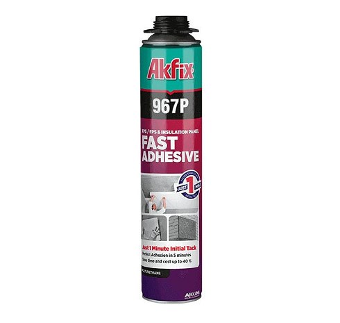 Akfix 967P — однокомпонентный профессиональный полиуретановый клей-пена с быстрым первичным схватыванием. Используется для быстрого и прочного склеивания большинства видов строительных материалов, особенно теплоизоляционных плит. Первичное схватывание происходит в течение 60 секунд, а надежное прилипание — через 5 минут.
