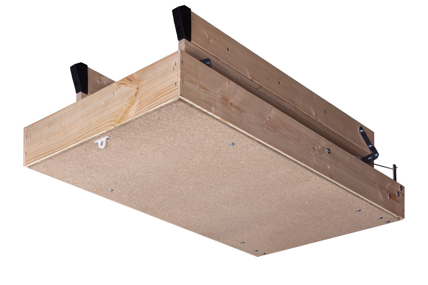 Лестница выдерживает нагрузку до 150 кг, при этом сама она легкая - ее просто складывать и раскладывать одним касанием руки. Несмотря на простоту, она оснащена поворотным замком, надежно фиксирующим люк в закрытом состоянии.