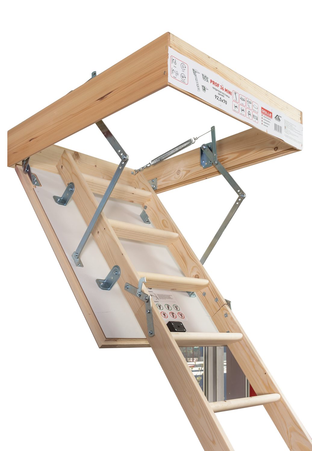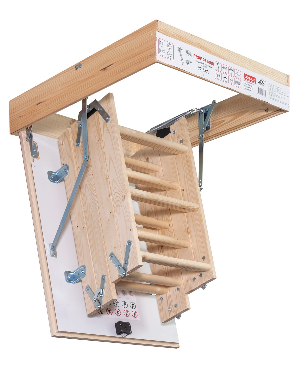 PROF 36 MINI изготавливается строго по лицензии DOLLE(производитель лестниц из Дании) и имеет надежную фурнитуру, поэтому соответствует всем техническим и европейским нормам безопасности EN 14975.