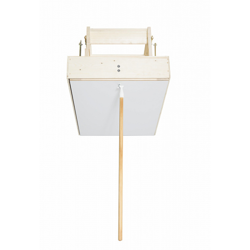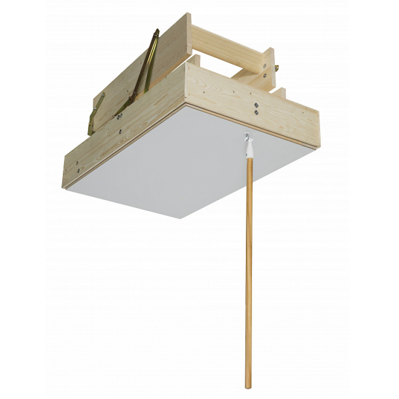 Обеспечивает легкий, комфортный подъем на верхние этажи частных домов, загородных коттеджей и дач. В изготовлении лестницы используется дерево хвойных пород. Лестница оснащена утепленным двусторонним белым люком, который практически не заметен на потолке. В случае необходимости крышку люка можно перекрасить в любой другой, подходящий для интерьера цвет.