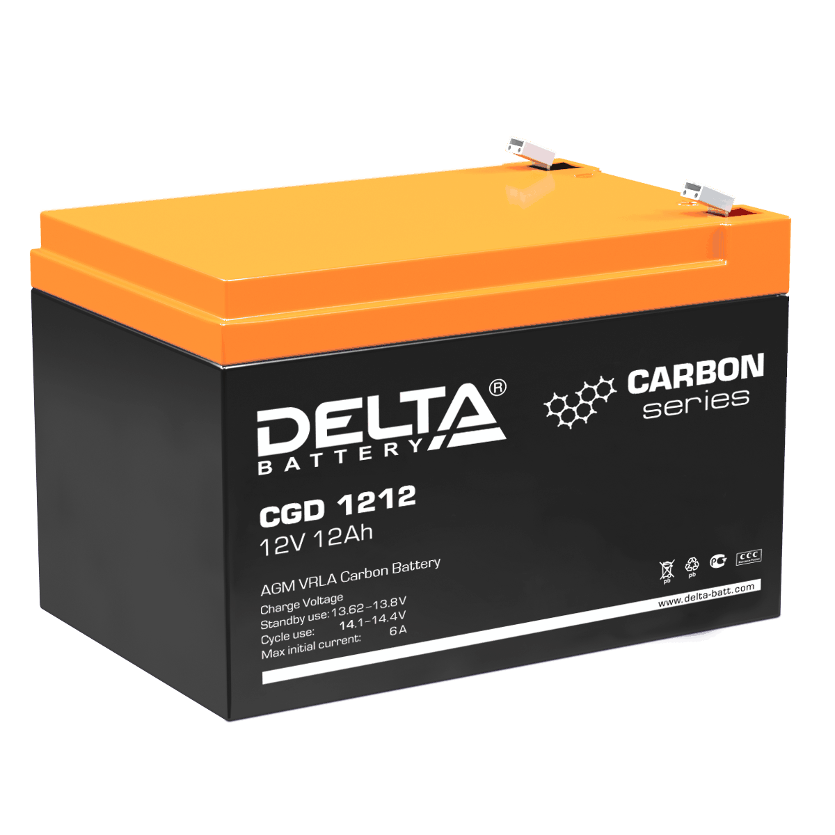 Свинцово-кислотный аккумулятор Delta новой линейки CGD выпускается с напряжением 12 В и ёмкостью 12 Ач. В основе лежит технология AGM, жидкий электролит удерживается внутри стекловолоконных сепараторов неподвижно. Отличительная особенность серии — карбоновое добавление, оно обеспечивает повышенную устойчивость к глубоким разрядам и температурному воздействию. Аккумулятор Delta CGD способен длительное время работать под высокой нагрузкой в тяжёлых режимах работы. Линейка с карбоновым добавлением может использоваться в циклическом и буферном режиме, в любом случае срок службы внушительный: до 1800 циклов заряда\разряда и до 15 лет в буферном режиме.