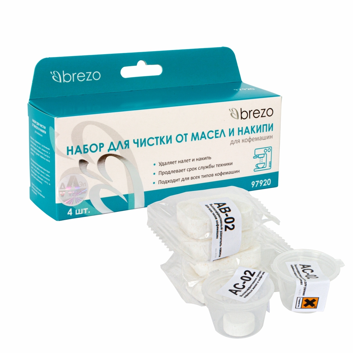 Набор для чистки кофемашин, 2 таблетки для чистки от кофейных масел, 2 порции для чистки от накипи и известковых отложений, бренд: BREZO, арт. 97920