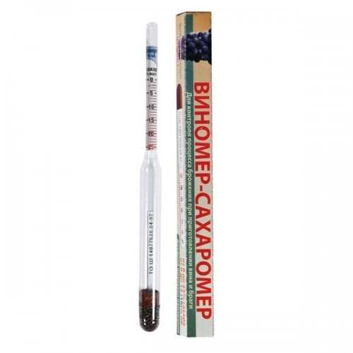 Виномер бытовой – простой прибор, предназначенный для измерения сахара в растворах. Он показывает концентрацию сахаров в винах и других напитках. Незамысловатое приспособление позволяет изготавливать столовые и десертные вина по рецепту. Диапазона измерений от 0 до 25% вполне достаточно, т.к. верхнее значение является максимальным возможным для данного вида напитков.