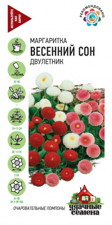 Неприхотливое, очень зимостойкое растение из семейства Астровые высотой до 12 см. Цветет в апреле - июле, при хорошем уходе цветение продолжается до осени с перерывом в жаркий период сезона. Соцветия в виде плотных помпонов, 3 см в диаметре, белой, розовой, красной окраски. Хорошо растет на любых почвах. Светолюбивое растение, но хорошо выдерживает легкое затенение. Выращивают посевом в открытый грунт. Всходы появляются через 7-10 дней. Маргаритка прекрасно подходит для посадки на клумбах, рабатках, а также в горшках и балконных ящиках.