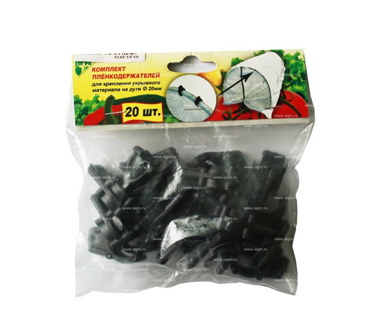 Предназначен для закрепления укрывного материала (п/эт плёнка, спанбонд и т.д.) на пластмассовые дуги или каркас парника (диаметр дуги 20мм). Материал - полиэтилен, кол-во в упаковке - 20шт. Поставляются в индивидуальном п/эт пакете с отверстием для вертикальной навески в торговом зале.