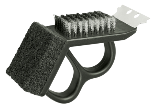Удобная щетка для чистки гриля Союзгриль N1-A01 поможет очистить мангал, шампуры и другие металлические аксессуары для пикника от гари. Производитель предусмотрел сразу 3 инструмента для устранения загрязнений различной интенсивности. Скребок сможет снять наиболее сильные пригорелости, им удобно работать по плоским поверхностям. Если же необходимо снять копоть или значительный слой жира, используется щетка со стальными ворсинками. На последнем этапе очистки пригодится поролоновая губка, которая сможет самостоятельно снять незначительные загрязнения и отполировать поверхность. Работать щеткой удобно благодаря эргономичной ручке, которая защитит руки от царапин в ходе чистки.