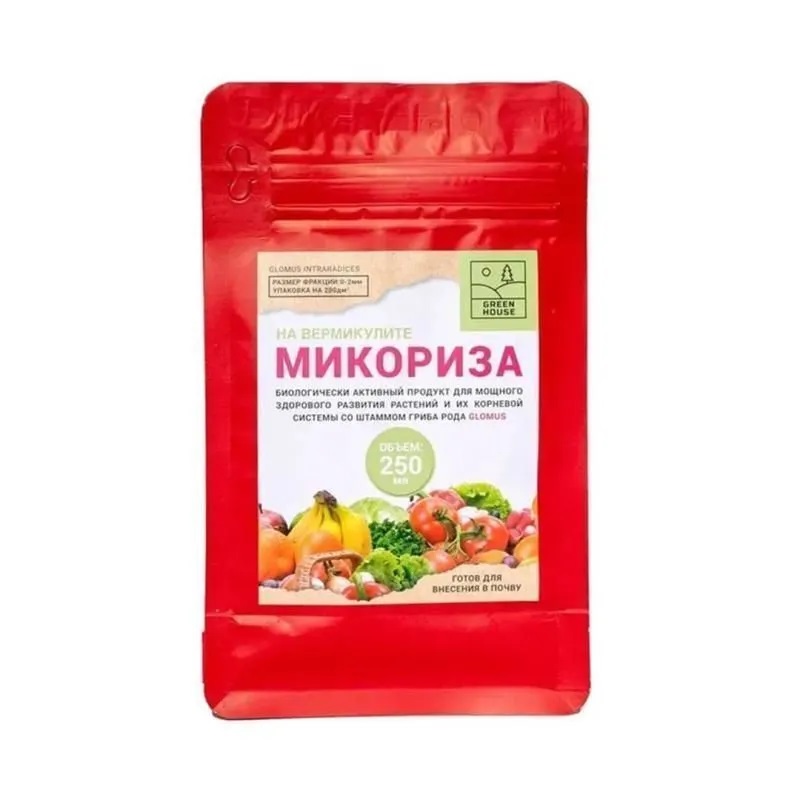 Микориза, 250 мл. (грибокорень особый вид полезных почвенных микроорганизмов грибов Glomus intraradices). В почве вступает в симбиоз с клетками корней растений и образует корневидные наросты. Создается симбиотическая связь между корнями растений и мицелием грибов. Благодаря микоризе растение увеличивает площадь поверхности корней от 100 до 1000 раз, снабжая себя недоступными для корней элементами питания и влагой, которые извлекаются через внешнюю связь мицелия.